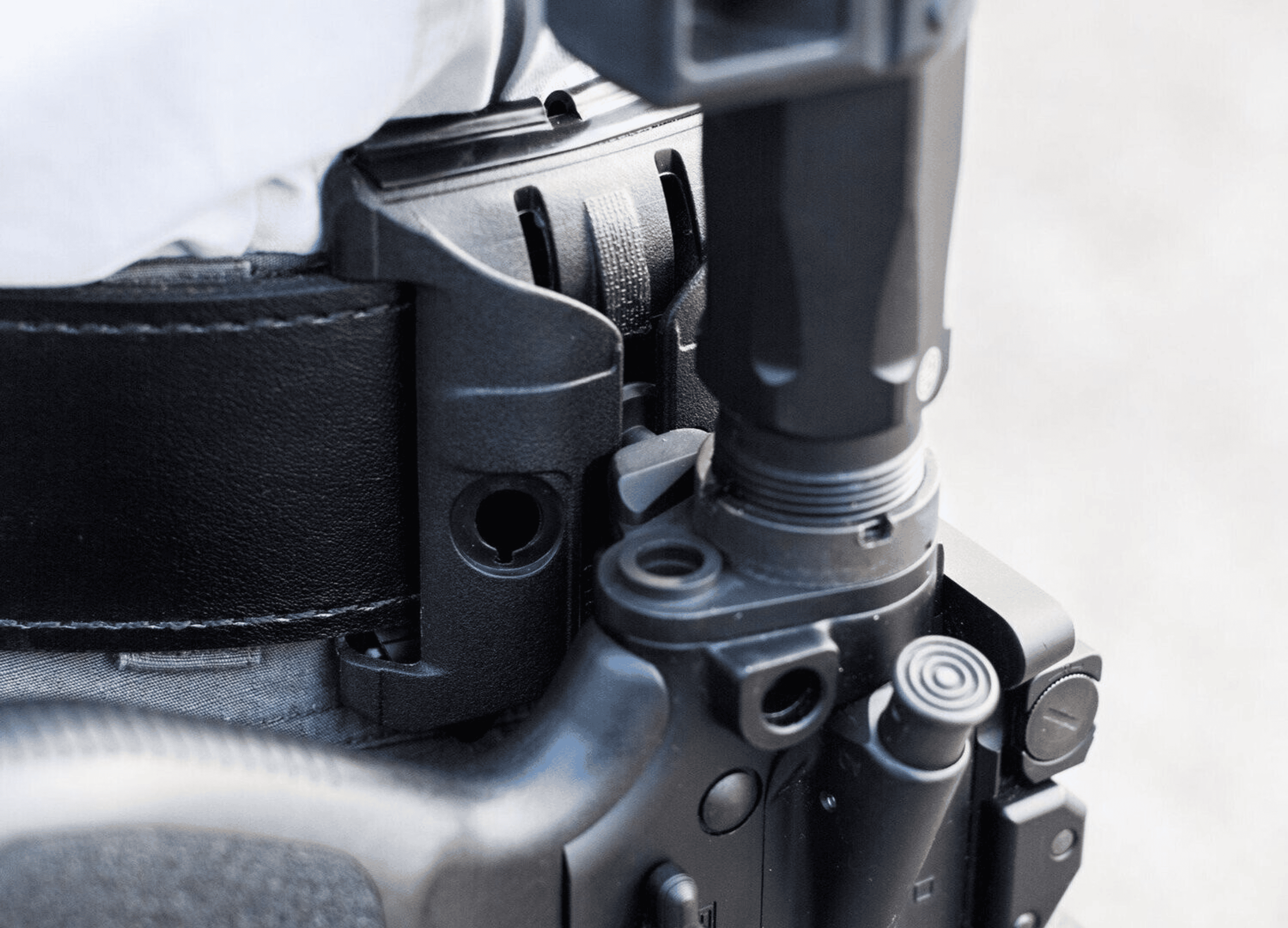 2 piece system that contains the AR buffer tube plate with knuckle design & built-in QD port (Easily replaces the buffer tube plate on AR platform) & the all-new Gen2 Holster that can attach to MOLLE gear or belts including duty belts. Reduces Fatigue & Improves Weapon Control While Hands Are Free. Most Effective With a Sling For Double Connection To Your Weapon.