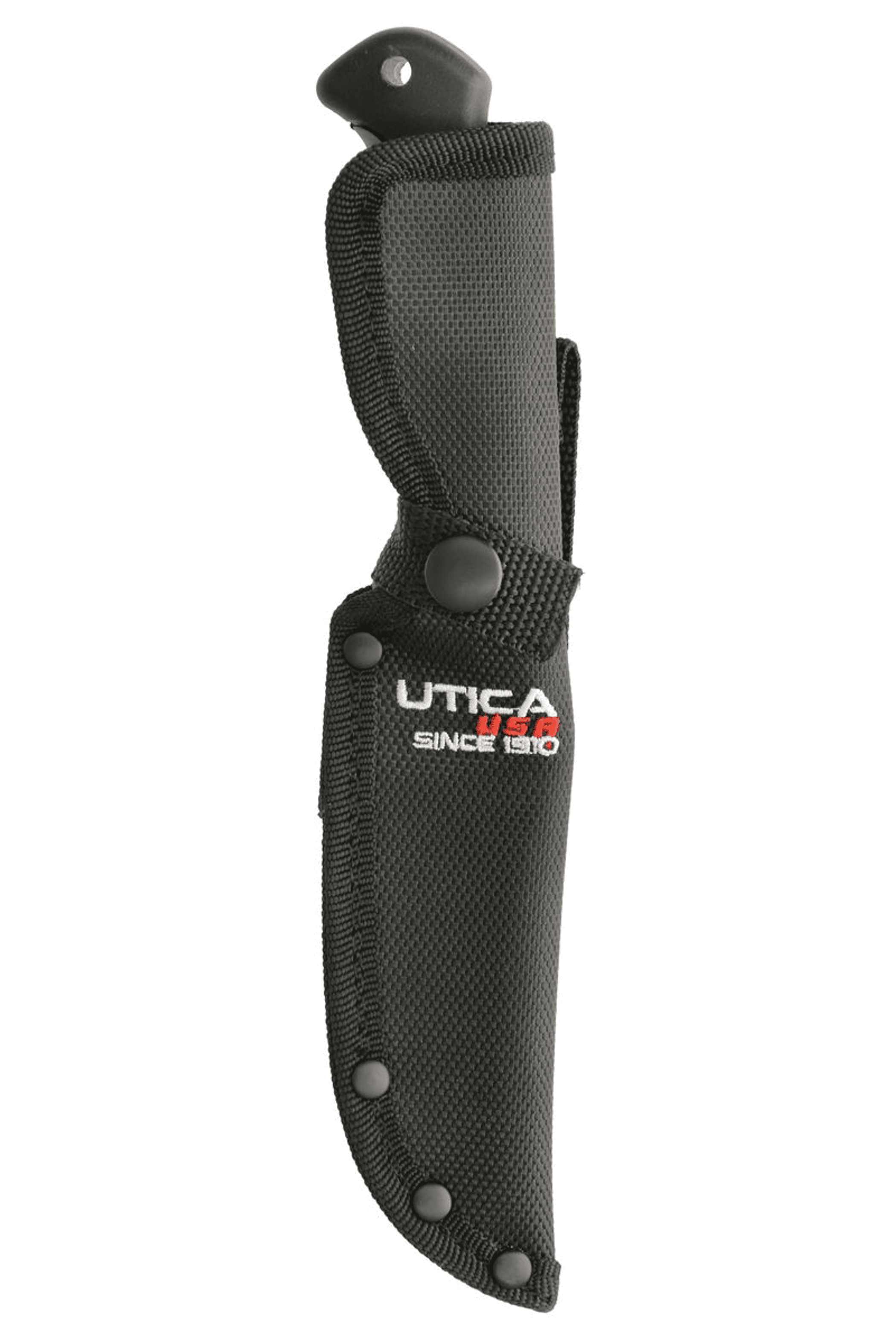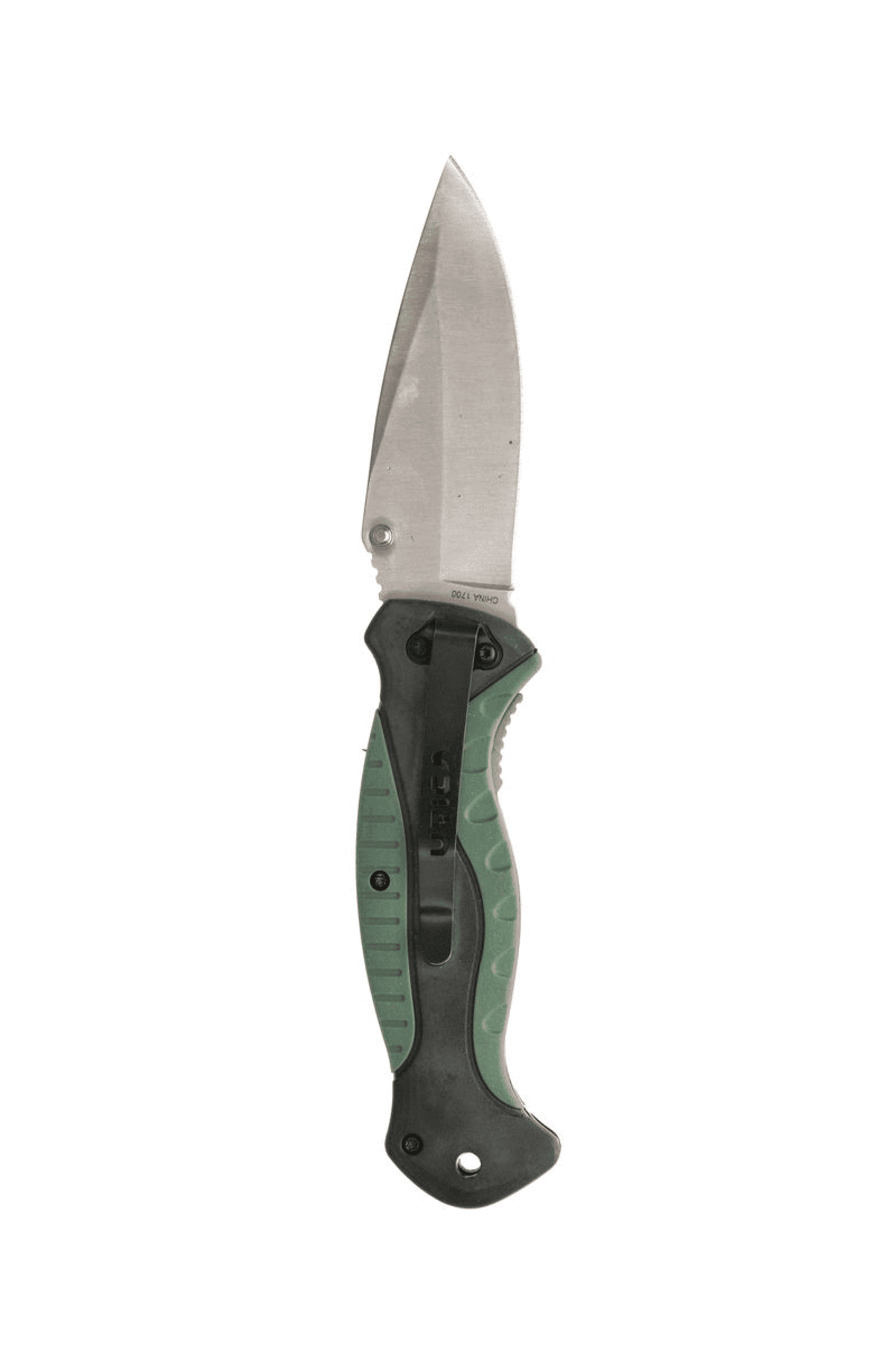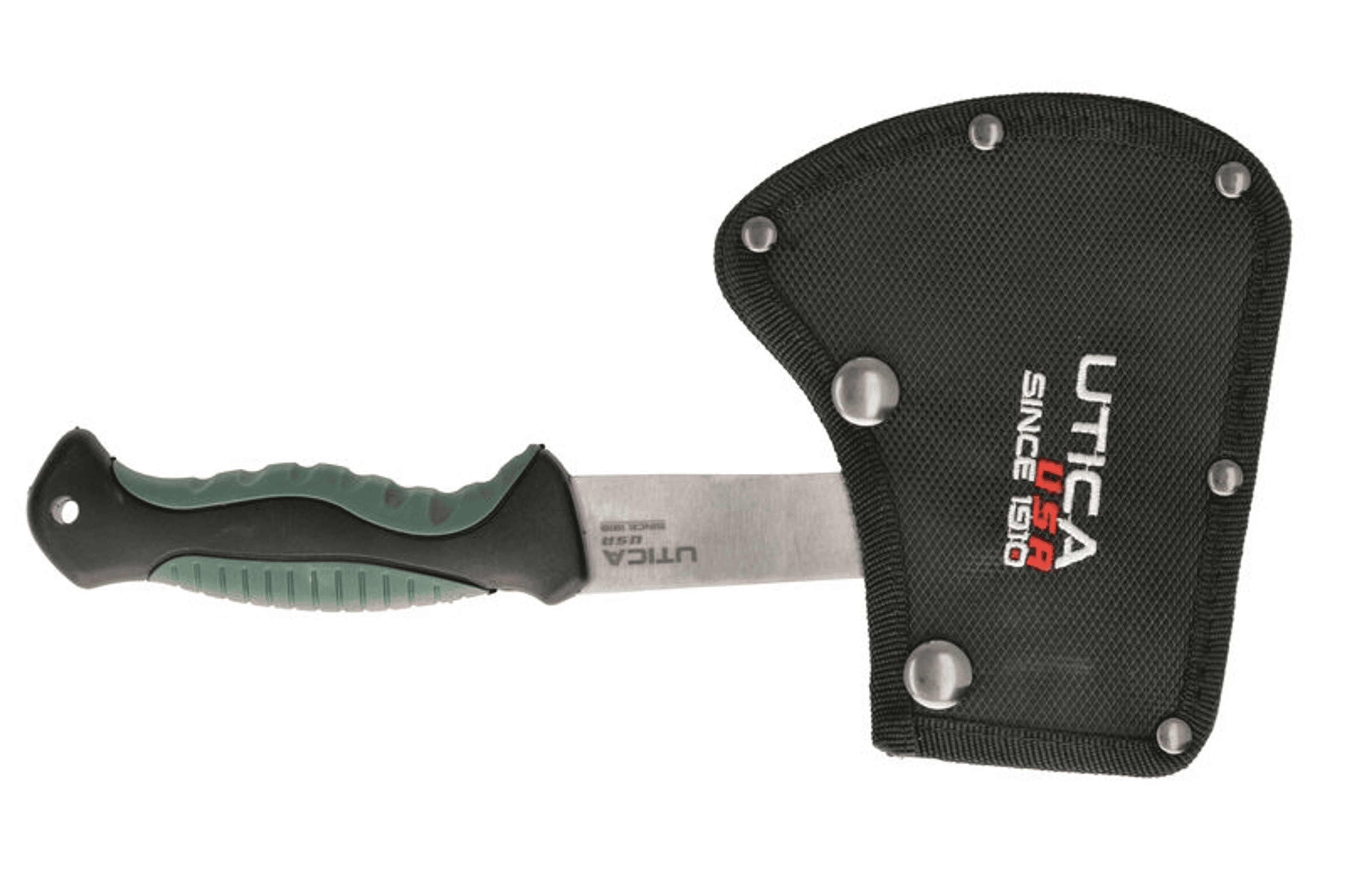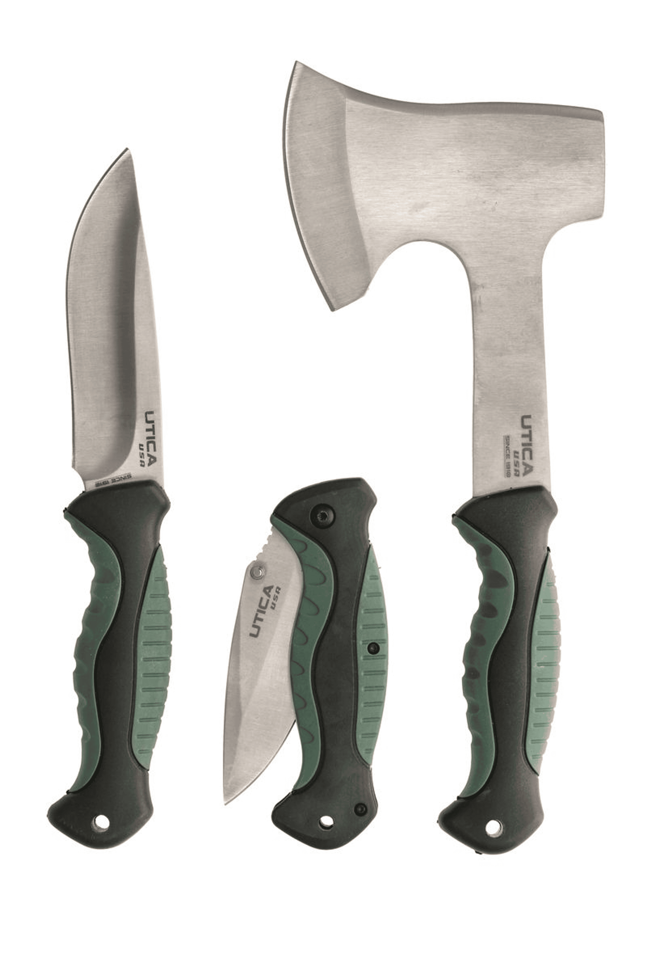 Folding Liner Lock with Nylon Washer, 3.3" blade, .125" thick blade and pocket clip. Fixed blade with 4.25" blade, .22" thick blade and nylon sheath. Hatchet with 5.7" blade, .23 thick blade and nylon sheath. All pieces have polypropylene + glass fiber, rubber grip handles. Handles are 4.75".