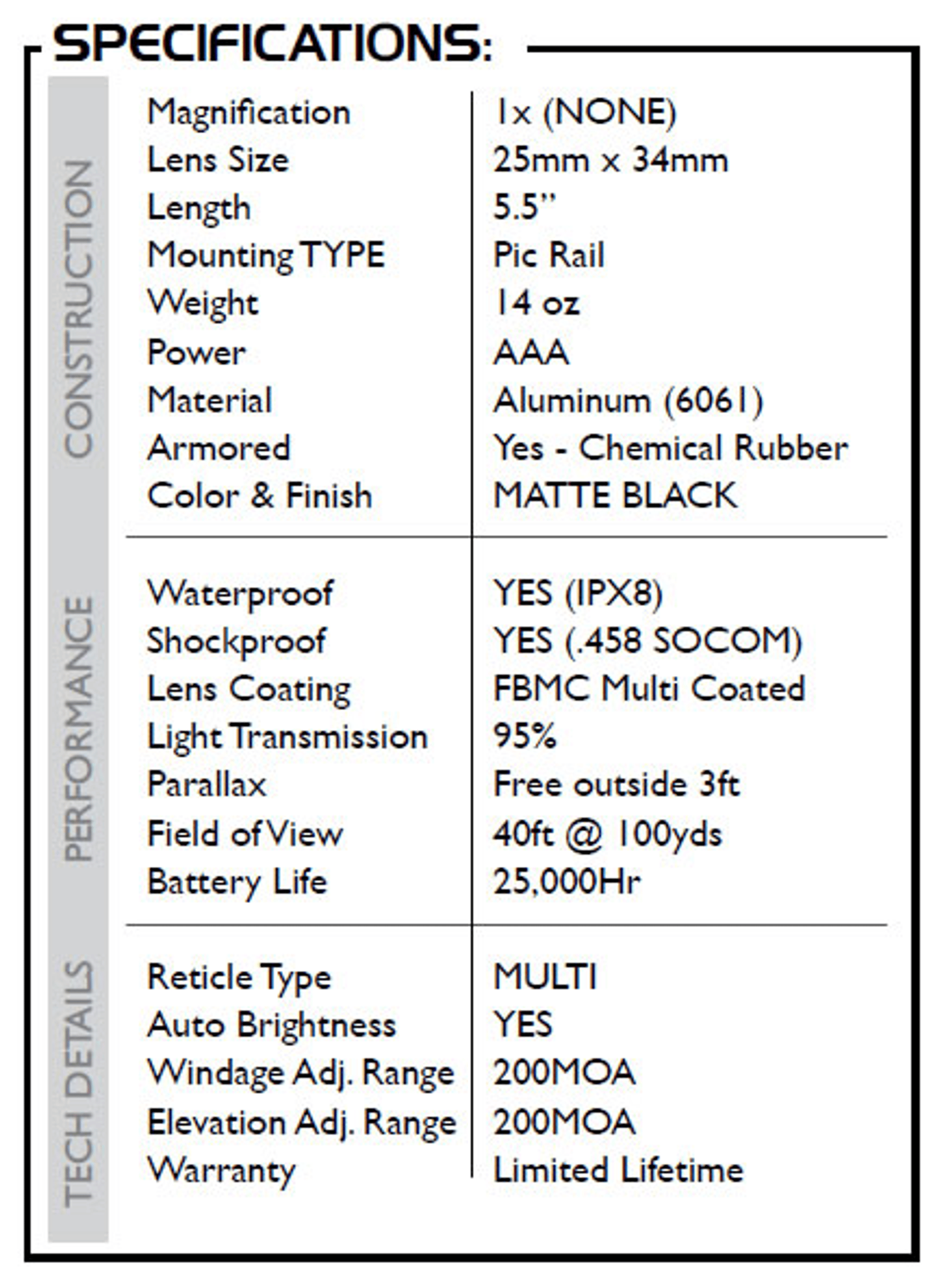 The HD7 Red Dot sight from LUCID Optics has been proven and battle tested in the very capable hands of Law Enforcement and Military professionals for over a decade. Through the years we have improved and upgraded this sturdy optic substantially. Now in the Generation (4) these improvements include a new reticle set with more capabilities for the operator built in and some less noticeable durability concerns addressed. We also have upgraded the buttons to be more positive in action and the light sensor is nearly twice as sensitive as previous versions.HD7 has been designed from the ground up to be a strong, reliable optic that offers the most in operator selectable features and benefits that exceed the market standards at a price that is friendly to the wallet. This Optic still sports features that makes sense, like a common AAA power cell and a proven parallax free multi reticle system that has no POI shift when transitioning between the reticles.