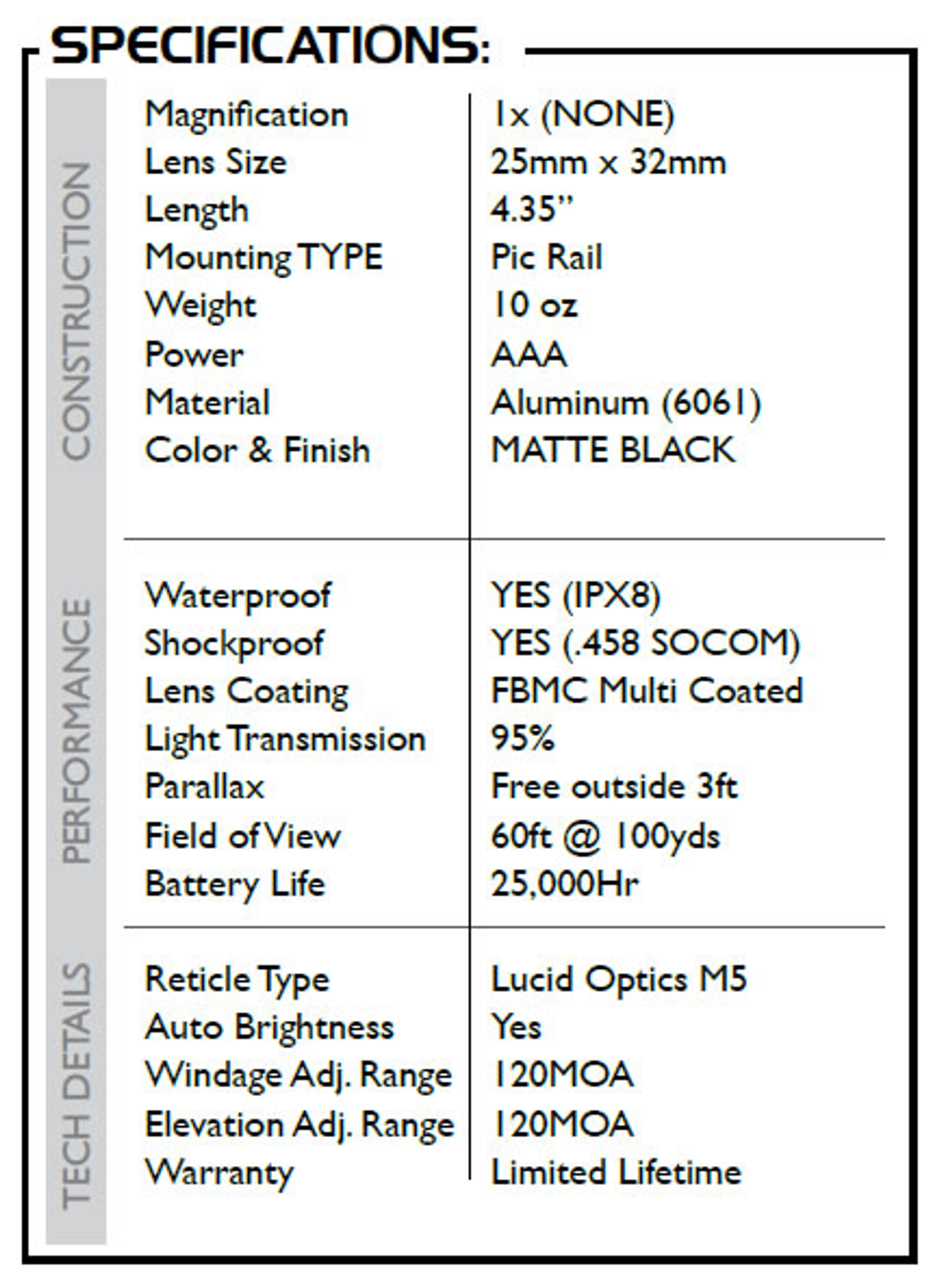 HDx - Mid Sized Red Dot SightWith the rise of the PCC competitions, there was a need for an overbuilt "mid-sized" red dot sight with modular mounting options. It had to be fast, durable, and easy to use.Featuring the new M5 Reticle, the HDx is fast and nimble, up to 30% faster than a conventional dot. The auto brightness controls which are brought over from the success of the HD7, the HDx is sure to be a favorite, as the optic can age the reticle brightness dynamically.With modular mounting the HDx will be at home on a Picatinny rail, no matter if it is a AR-15 platform or something from the Eastern Block. The power source could not be easier to find or change. positioned out of the way in the 2 O'Clock Position, we use a common AAA power cell to light up the reflex sight.NOTE: For the best long term power solution we highly recommend a quality lithium battery for use in the HDx.